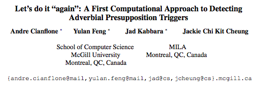 Let’s do it “again”: A First Computational Approach to Detecting Adverbial Presupposition Triggers. Andre Cianflone, Yulan Feng, Jad Kabbara and Jackie Chi Kit Cheung.