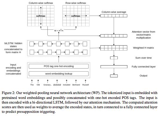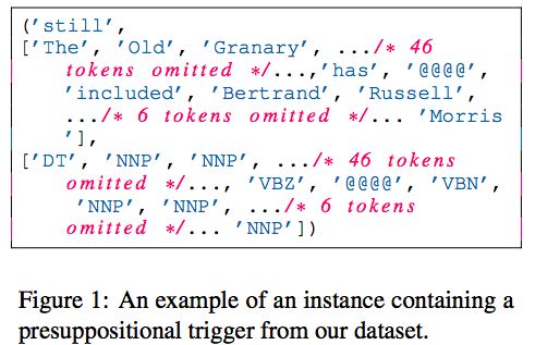 在这篇论文中,我们提出一个检测状语预设的触发器的任务,例如“also”或“again”这类词。解决个任务需要在话语语境中检测重复或类似的事件,可以应用在自然语言生成任务(例如总结和对话系统)任务。我们为该任务创建了两个新的数据集,数据来源于Penn Treebank和Annotated English Gigaword两个语料库,以及为此任务量身定制的新的注意力机制。我们的注意力机制增加了一个基线递归神经网络,而且不需要额外的可训练参数,从而最大限度地减少了计算成本。我们的工作证明,我们的模型在统计学上优于一些基线模型,包括基于LSTM的语言模型。