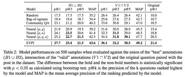 提问(inquiry)是沟通的基础。除非能提出问题,机器无法有效地与人类合作。在这项工作中,我们建立了一个神经网络模型来排序澄清性问题。我们的模型受到完美信息期望值(expected value of perfect information)的启发:一个问题好不好在于其预期答案是否有用。我们使用来自StackExchange的数据来研究这个问题。StackExchange是一个丰富的在线资源,人们在上面提问一些澄清式的问题,以便更好地为原始的帖子提供帮助。我们创建一个由大约77k帖子组成的数据集,其中每个帖子包含一个问题和回答。我们在500个样本的数据集上对我们的模型进行了评估,并与人类专家的判断进行对比,证明了模型在控制基线上得到重大改进。