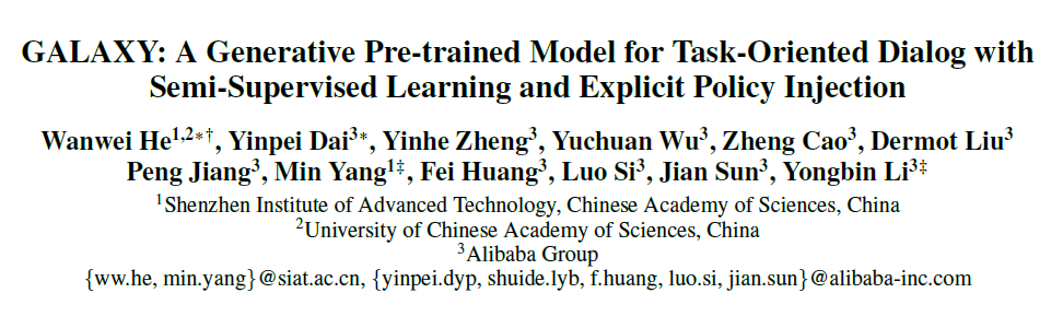 [5] He W, Dai Y, Zheng Y, et al. GALAXY: A Generative Pre-trained Model for Task-Oriented Dialog with Semi-Supervised Learning and Explicit Policy Injection[J]. arXiv preprint arXiv:2111.14592, 2021.