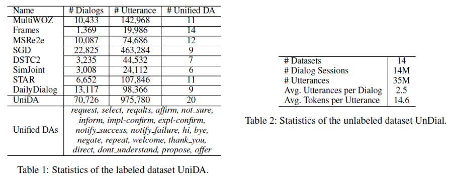 数据集:本文使用 11 个部分标注的任务型对话数据集对模型进行预训练,总共 2.3M 句话语,包含 80 个领域。数据集及其标注信息如下表所示。