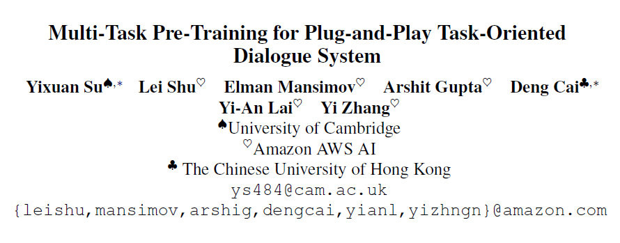 [4] Su Y, Shu L, Mansimov E, et al. Multi-Task Pre-Training for Plug-and-Play Task-Oriented Dialogue System[J]. arXiv preprint arXiv:2109.14739, 2021.