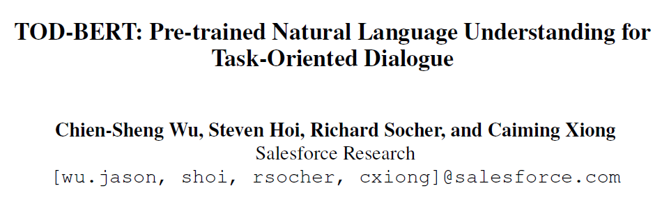 [2] Wu C S, Hoi S C H, Socher R, et al. TOD-BERT: Pre-trained Natural Language Understanding for Task-Oriented Dialogue[C]//Proceedings of the 2020 Conference on Empirical Methods in Natural Language Processing (EMNLP). 2020: 917-929.