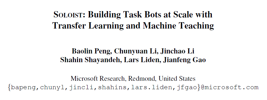 [3] Peng B, Li C, Li J, et al. Soloist: Building task bots at scale with transfer learning and machine teaching[J]. Transactions of the Association for Computational Linguistics, 2021, 9: 807-824.