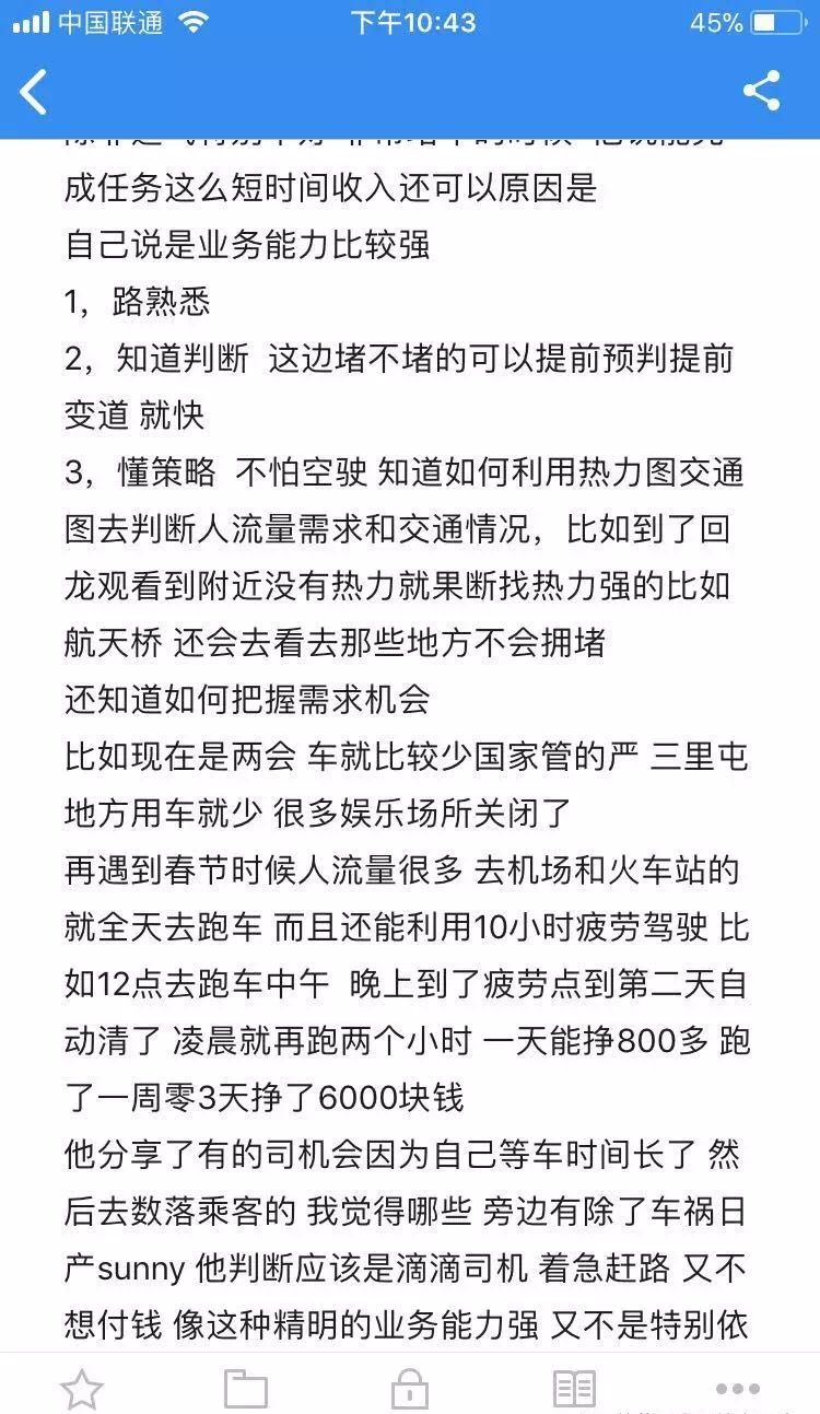 有意思的是,之前在城市道路规划院的那个司机, 他觉得一个人开滴滴很寂寞, 后来他外甥也在开,而且路子比较广,于是就让他外甥召集一帮滴滴司机, 组织了一个群,自己当群主,这样干活就有意思了,不寂寞了。