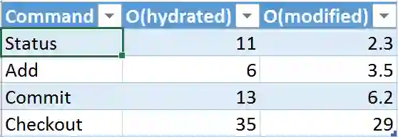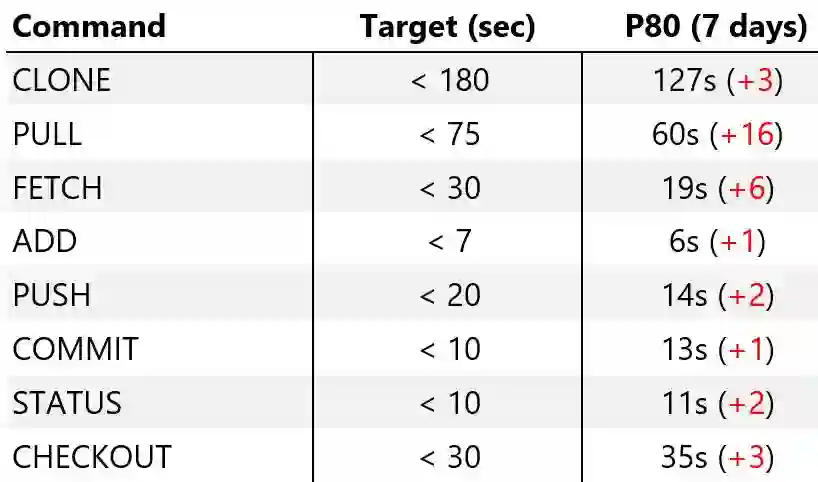 先说一下背景,用原生的 Git (“vanilla Git”)实现 ,很多命令耗时 30 分钟或几个小时,有些甚至永远无法执行。相较于此,如果大部分命令在 20 秒内完成,就已经是一个巨大的进步。但是对于用户来说,每次运行命令都需要等待 10 - 15 秒,仍然是非常糟糕的体验。