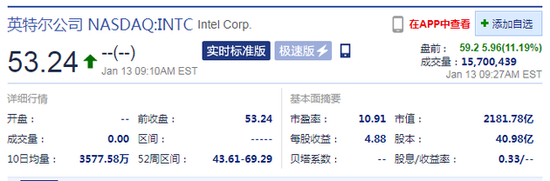 截止发稿前,英特尔盘前涨超11%报59.2美元: