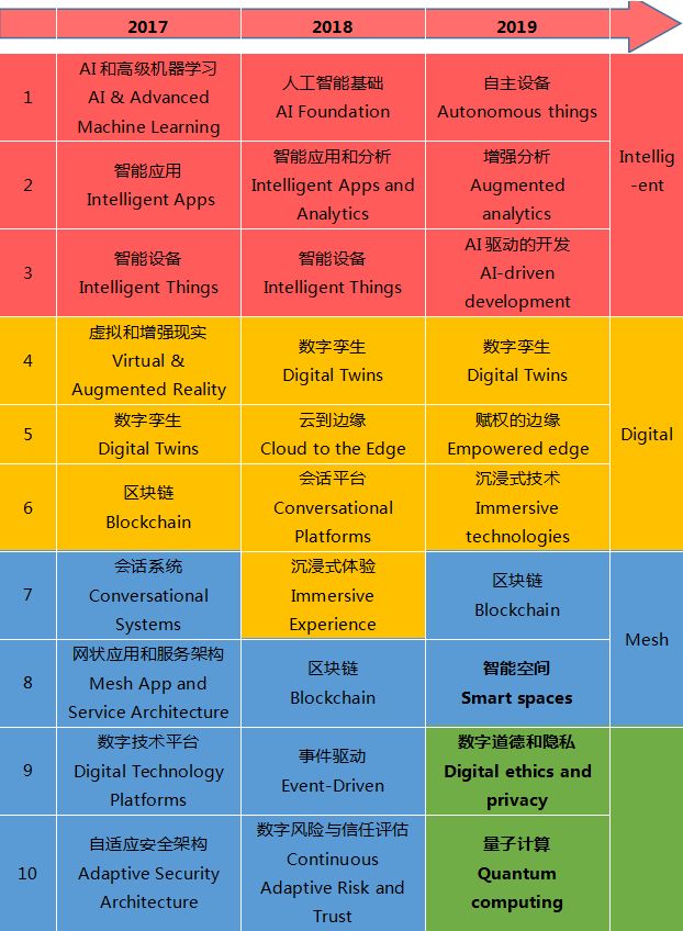 趋势1:自主设备;趋势2:增强分析;趋势3:人工智能驱动的开发;趋势4:数字孪生;趋势5:赋权边缘;趋势6:沉浸式技术;趋势7:区块链;趋势8:智能空间;趋势9:数字道德和隐私;趋势第10号:量子计算。