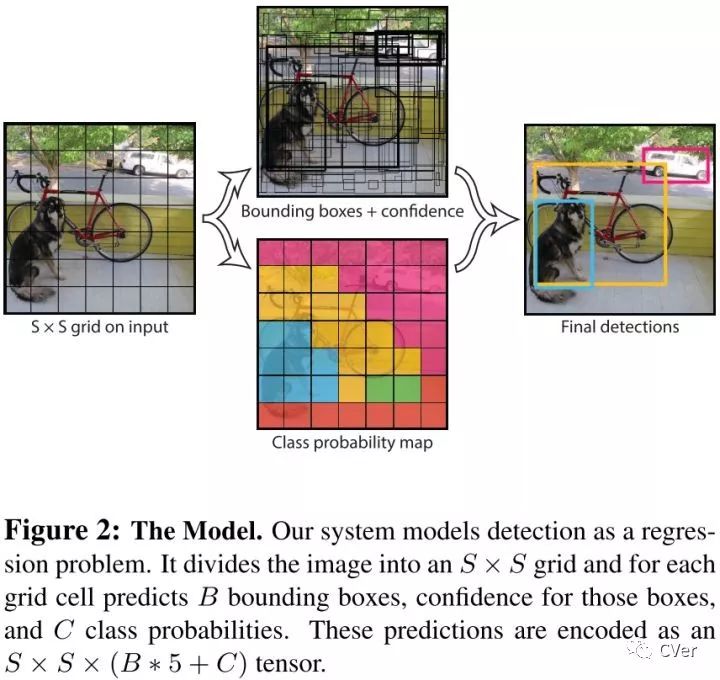 YOLO将输入图片分成SXS个网格,如果某个目标的中心点落到其中一个格点,那么该格点就负责该目标的检测。每个格点预测出B个bbox和每个bbox的置信分数。