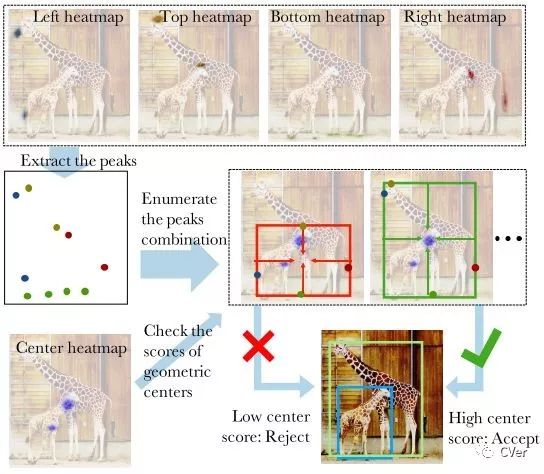 作者使用了最佳的关键点估计框架,通过对每个目标类预测4个多峰值的heatmaps来寻找极值点。另外,作者使用每个类center heatmap来预测目标中心。仅通过基于几何的方法来对极值点分组,如果4个极值点的几何中点在center map上对应的分数高于阈值,则这4个极值点分为一组。