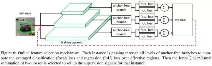 实例输入到特征金字塔的所有层,然后求得所有anchor-free分支focal loss和IoU loss的和,选择loss和最小的特征层来学习实例。训练时,特征根据安排的实例进行更新。推理时,不需要进行特征更新,因为最合适的特征金字塔层自然地输出高置信分数。