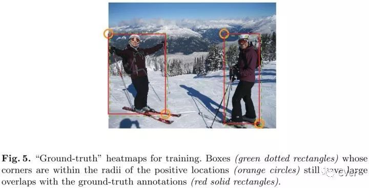 第一个通道ground truth map的正标签区域由半径为r的圆填充,圆的中心点位于bbox的中点。而剩下的4个通道由bbox的2个角点决定。