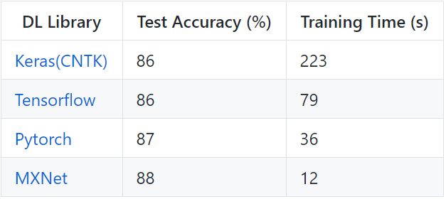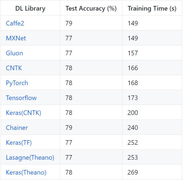 [ 导读 ]近日,Ilia Karmanov 在 Medium 发表了一篇题为《Neural Net in 10 Frameworks (Lessons Learned)》的文章,其内容源自一个 GitHub 项目,其中作者通过构建同一个神经网络,对比了当前最流行的 10 种深度学习框架,其中 Caffe2 和 MXNet 在准确度和训练时长上处于领先位置。该项目甚至还得到了 FAIR 研究者、各大框架创始人(比如贾扬清)的支持。