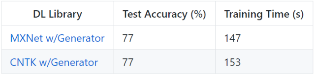 1. 为方便对比,上文中的实例(除了 Keras)使用同等水平的 API 和同样的生成器函数。我在 MXNet 和 CNTK 的实验中使用了更高水平的 API,在该 API 上使用框架的训练生成器函数。该实例中的速度提升几乎微不足道,原因在于整个数据集作为 NumPy 数组在 RAM 中加载,每个 epoch 所做的唯一的处理是 shuffle。我怀疑该框架的生成器也在异步执行 shuffle 操作。奇怪的是,似乎框架在一个批次水平上进行 shuffle,而不是在观察层面上,因此测试准确率稍稍降低(至少在 10 epoch 之后)。在框架运行时进行的 IO 活动、预处理和数据增强的场景中,自定义生成器对性能的影响更大。