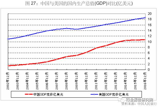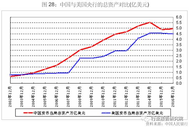 2016年,中国国内生产总值(GDP)现价换算成为美元约为10.73亿美元,美国国内生产总值(GDP)现价为18.57亿美元,前者是后者的57.8%。同年,中国央行的总资产换算成为美元约为4.96亿美元,美国央行的总资产为4.50亿美元,前者是后者的1.1倍。