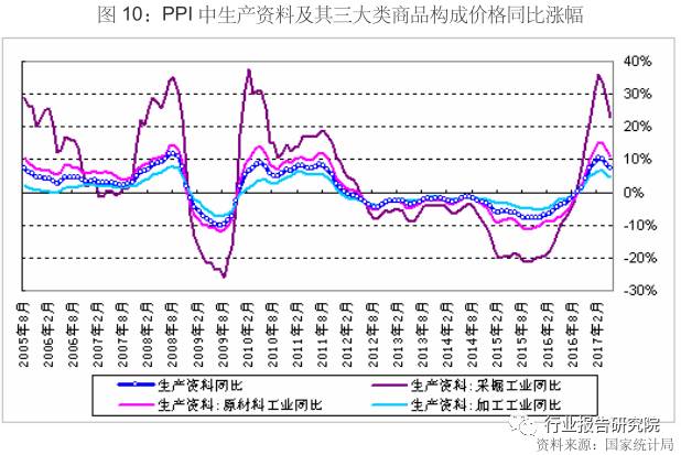 从2016年第一季度开始,工业生产者出厂价格指数(PPI)出现明显上涨趋势,在 2017年第一季度达到顶峰,从第二季度开始转入下跌走势。