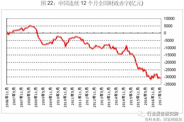 2008年以后,全国财政一直处于赤字状态,2014年以后连续12个月全国财政赤字规模明显扩大;2016年至今,连续12个月全国财政赤字规模基本稳定在3万亿元附近。2017年5月,连续12个月全国财政赤字3.09万亿元,超过了年度预算目标。