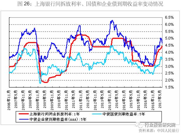 从2016年第四季度到2017年6月下旬,5年期AAA级企业债到期收益率上升了约2个百分点,1年期上海银行间拆放利率上升了约1.5 个百分点,5年期国债到期收益率上升了约1个百分点。市场利率快速较大幅度上涨,既是对货币政策转向稳健中性的反应,也是对经济高杠杆高泡沫风险的反应。