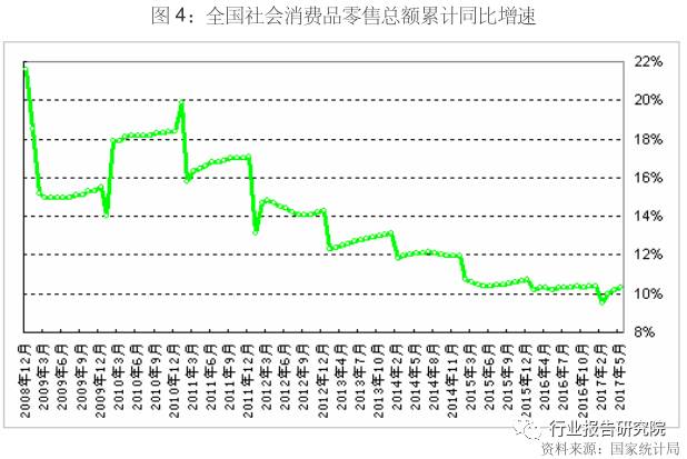 2017年下半年,国内生产总值(GDP) 同比增速预计下行,居民收入增速预计也将下行,全国社会消费品零售总额累计同比增速下行压力大,预计勉强稳定在10%附近。