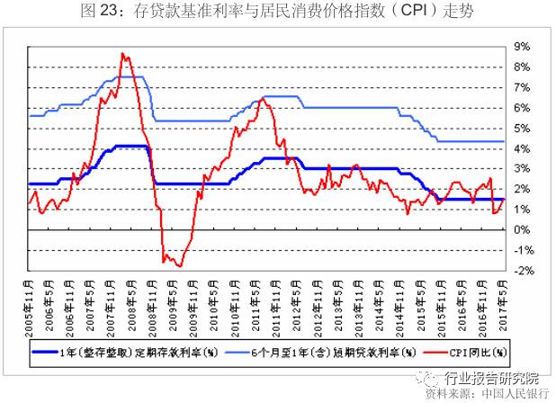 美联储已经多次加息,并可能于2017年下半年缩减资产负债表;中国经济增速预计下行,央行货币政策已经转向中性,降杠杆、挤泡沫、去产能任务艰巨;中国居民消费价格指数(CPI)基本围绕一年银行定期存款利率上下波动。综合考虑这些因素,2017年下半年,预计央行继续维持存贷款基准利率和存款准备金率不变。