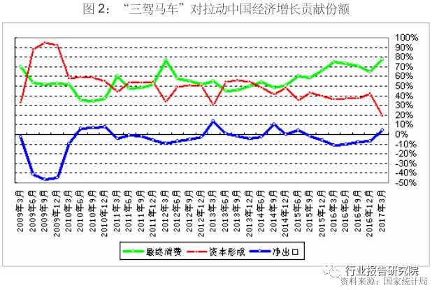 近两年来,最终消费支出对拉动中国经济增长贡献份额总体呈现稳步上升趋势,资本形成贡献份额总体呈现震荡下跌趋势,净出口贡献份额在0%附近震荡,2017年下半年,“三驾马车”对拉动中国经济增长贡献份额预计延续该趋势。