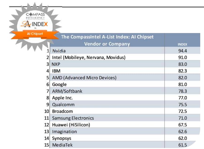 根据上述指标,Compass Intelligence给出的AI芯片公司排名(前15名)如下图: