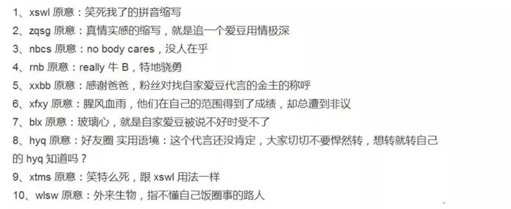 如今缩写体被新一代少男少女广泛运用于QQ空间、贴吧、微博的“扩列”行为中,也成为饭圈粉丝的普遍用语习惯。替代性语言的使用反映了群体文化的需要:他们需要一种语言来确认成员身份,参与他们的社会和文化社区,以及确认群体的社会身份和他们在社会中的位置。