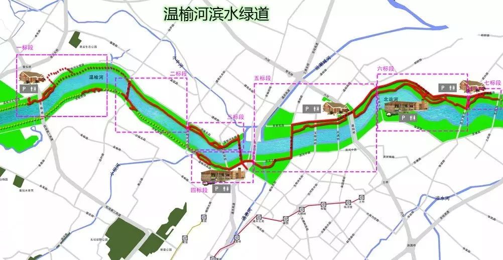 温榆河绿道沿着河流布置,起点为昌平区的沙河闸水库,终点为通州区的武窑桥,途经昌平、顺义、朝阳、通州四个区。