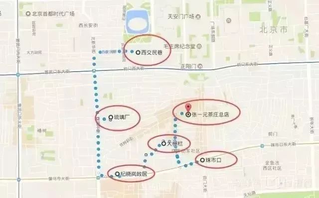 西交民巷—大栅栏—珠市口—琉璃厂—福瑞祥—张一元—内联升—北京坊—纪晓岚故居—琉璃厂文化街
