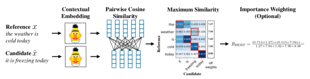 这一工作解决了这一问题,展示了一个用于序列配对的基于Bert的评分功能如何被设计用于文本生成评估,并能更好地与人类评估吻合。这一过程非常直观,并需要任何精调:只需要经过预训练的上下文嵌入,cosine相似度和基于频率的权重。