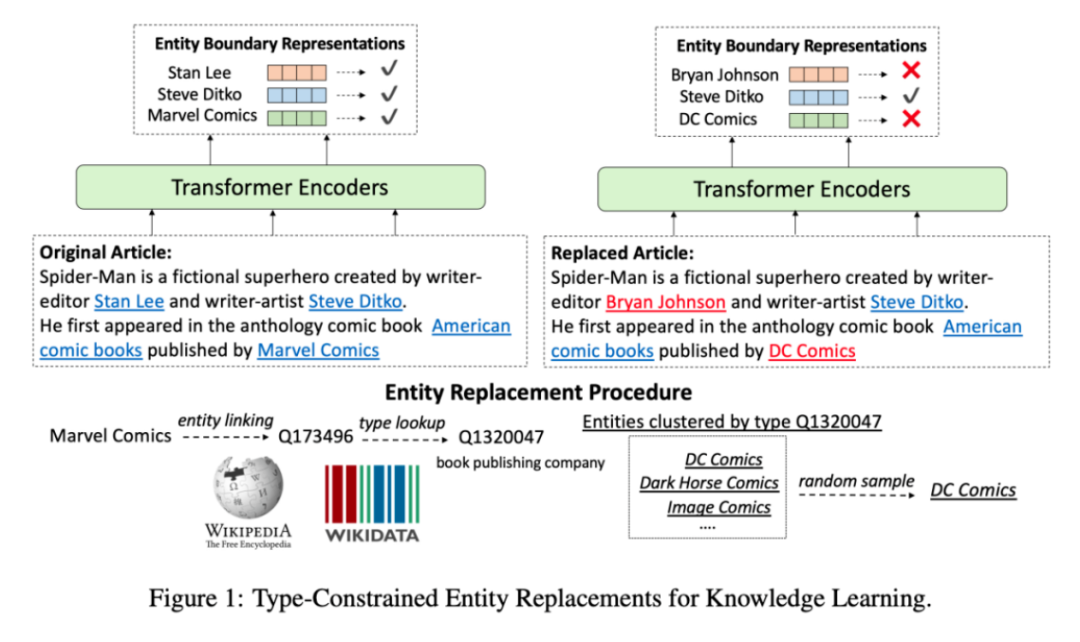 这篇文章用更结构化的数据:维基百科和它其中实体来研究自监督训练的能力,而不是应用普通的MLM模型。他们用其他相似类型的实体(如ELECTRA)替换了文本中的实体,模型学习通过上下文来识别这种被替换的句子。通过这种方法,模型被强制学习了现实世界实体的信息,以及它们之间的关系。