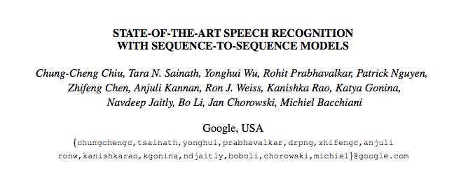 [4] C.C. Chiu, T.N. Sainath, Y. Wu, R. Prabhavalkar, P. Nguyen, Z. Chen, A. Kannan, R.J. Weiss, K. Rao, K. Gonina, N. Jaitly, B. Li, J. Chorowski and M. Bacchiani, “State-of-the-art Speech Recognition With Sequence-to-Sequence Models,” submitted to ICASSP 2018.