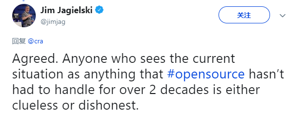 Apache软件基金会的联合创始人Jim Jagielski就在推特上写道:“这种说法不是无知,就是在故意说假话。”他还表示,Apache Web的开发人员一直对能被商业公司“搭便车”感到非常高兴。因为这可以进一步确保面向所有网络用户的公开、公平的竞争环境。