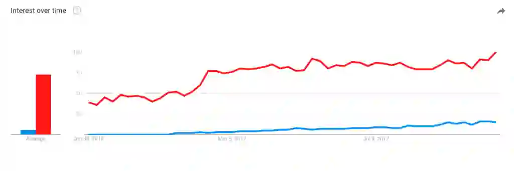 未来六个月中,开源的竞争将何去何从取决于 PyTorch 和 Caffe2 的应用以及各种开源合作。目前,Facebook 的解决方案似乎十分有潜力,但其解决方案的落实却远远落后于谷歌(请参见下面的 Google 趋势图)。