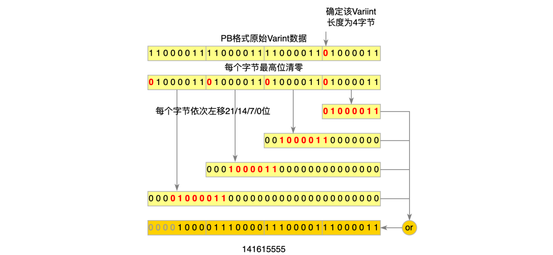 究其原因,CTR 场景的训练样本通常包含了大量的 int64 类型的特征,int64 在 PB 中是以 Varint64 类型数据存储的,ReadVarint64Fallback 方法就是用来解析 int64 类型的特征。普通的 int64 数据类型需要占用 8 个字节,而 Varint64 针对不同的数据范围,使用了变长的存储长度。PB 在解析 Varint 类型数据时,首先要确定当前数据的长度,Varint 用 7bit 存储数据,高位 1bit 存储标记位,该标记位表示下一个字节是否有效,如果当前字节最高位为 0,则说明当前 Varint 数据在该字节处结束。我们实际业务场景的 ID 特征大多是经过 Hash 后的值,用 Varint64 类型表达会比较长,这也就导致在特征解析过程中要多次判断数据是否结束,以及多次位移和拼接来生成最终数据,这使得 CPU 在解析过程中存在大量的分支预测和临时变量,非常影响性能。以下是 4 字节 Varint 的解析流程图: