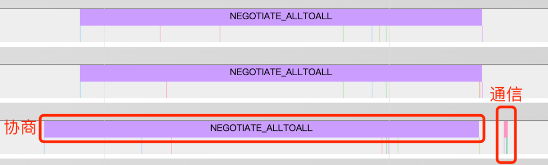 从图中可以看出,训练期间卡间通信耗时比较长,同时在通信期间 GPU 使用率也非常低,卡间通信是影响训练性能提升的关键瓶颈点。我们对通信过程进行拆解打点后发现,卡间通信(AllToAll、AllReduce、AllGather 等)协商的时间远远高于数据传输的时间: