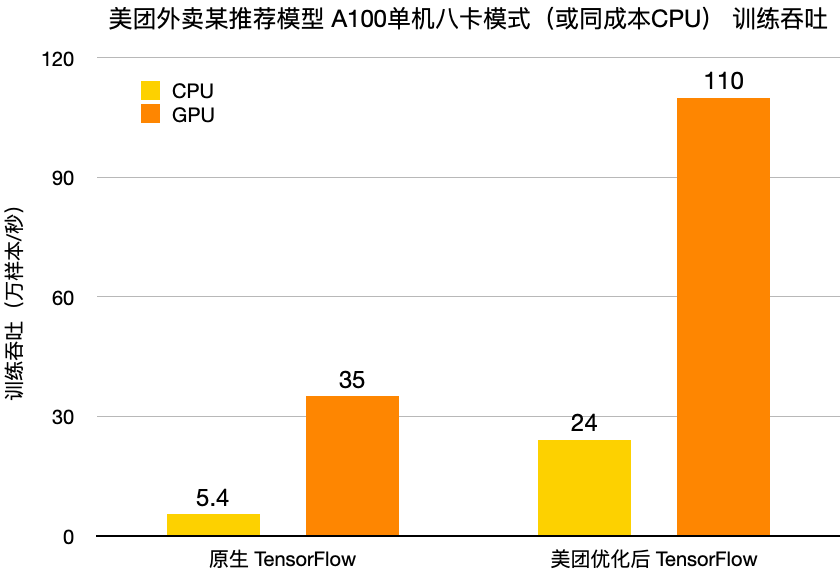 在推荐系统训练场景中,美团内部深度定制的 TenorFlow(简称 TF)版本[1],通过 CPU 算力支撑了美团内部大量的业务。但随着业务的发展,模型单次训练的样本量越来越多,结构也变得越来越复杂。以美团外卖推荐的精排模型为例,单次训练的样本量已达百亿甚至千亿,一次实验要耗费上千核,且优化后的训练任务 CPU 使用率已达 90% 以上。为了支持业务的高速发展,模型迭代实验的频次和并发度都在不断增加,进一步增加了算力使用需求。在预算有限的前提下,如何以较高的性价比来实现高速的模型训练,从而保障高效率的模型研发迭代,是我们迫切需要解决的问题。