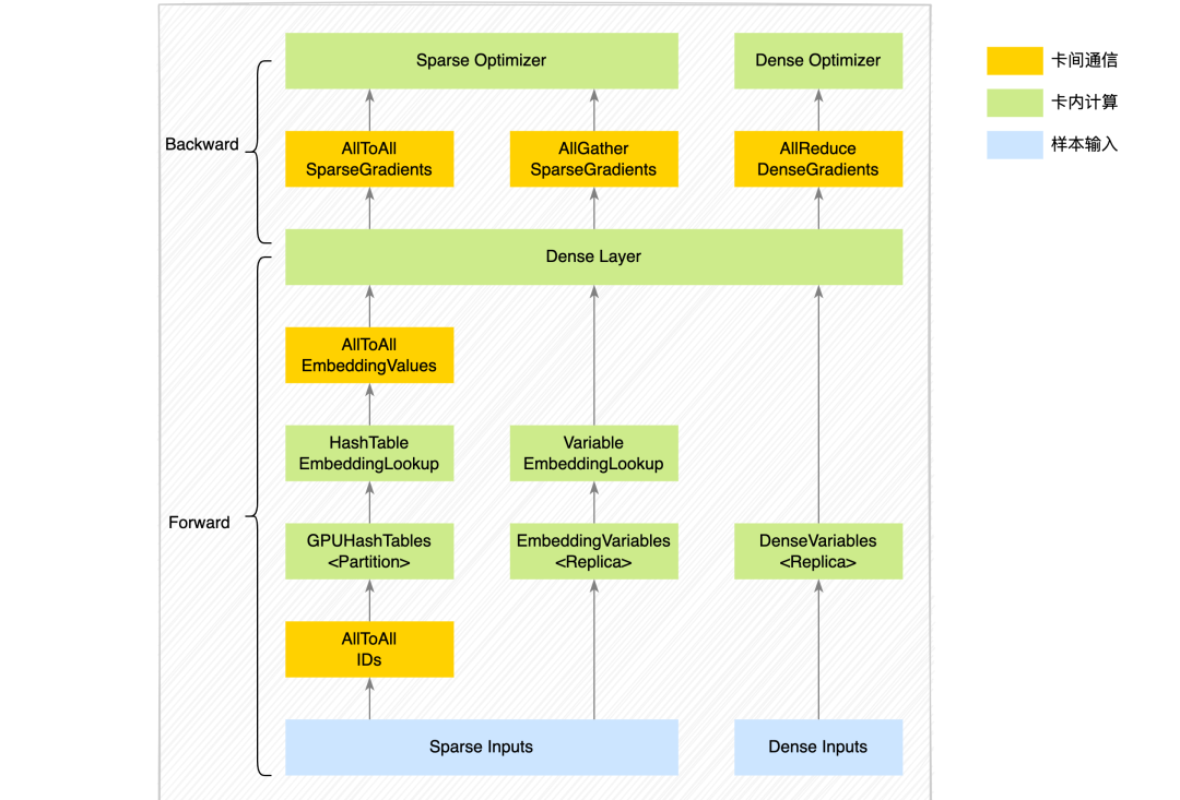 稀疏特征(规模较小,使用 Variable 存储):相比使用 HashTable 的区别,由于每张 GPU 卡都有全量的参数,直接在卡内查找模型参数即可。在反向聚合梯度的时候,会通过卡间 AllGather 获取所有卡上的梯度求平均,然后交给优化器执行参数优化。