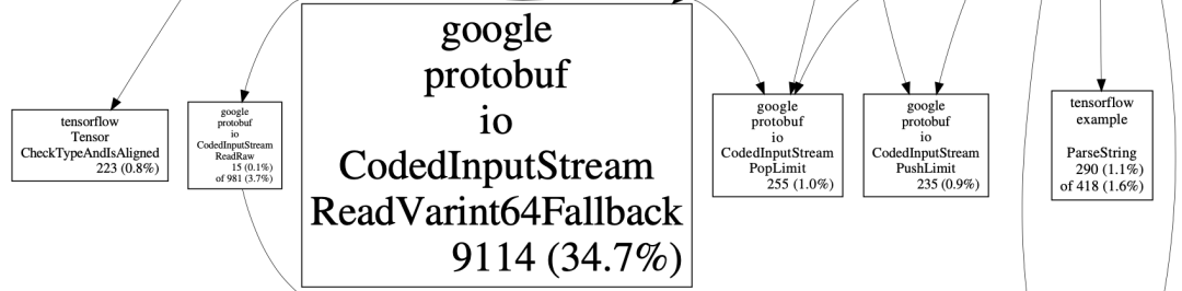 目前,美团内部绝大多数业务的样本数据都还是 TFRecord 格式,TFRecord 实际上是 ProtoBuf(简称 PB)格式。PB 反序列化非常耗费 CPU,其中 ReadVarint64Fallback 方法 CPU 占用较为突出,实际 profiling 结果如下图:
