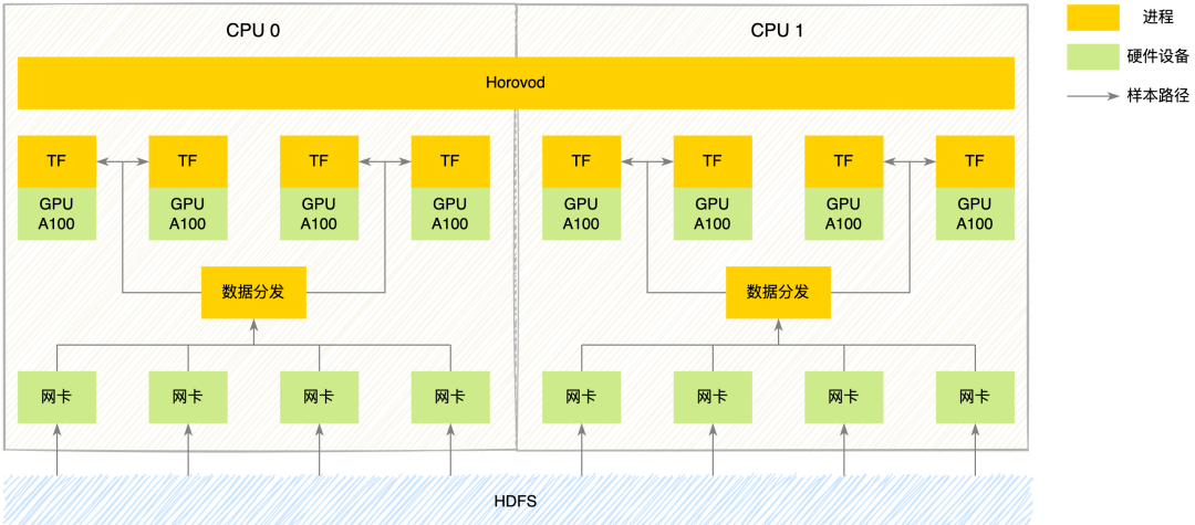 数据模块:美团自研了一套支持多数据源、多框架的数据分发系统,在 GPU 系统上,我们改造数据模块支持了多网卡数据下载,以及考虑到 NUMA Awareness 的特性,在每颗 CPU 上都部署了一个数据分发服务。