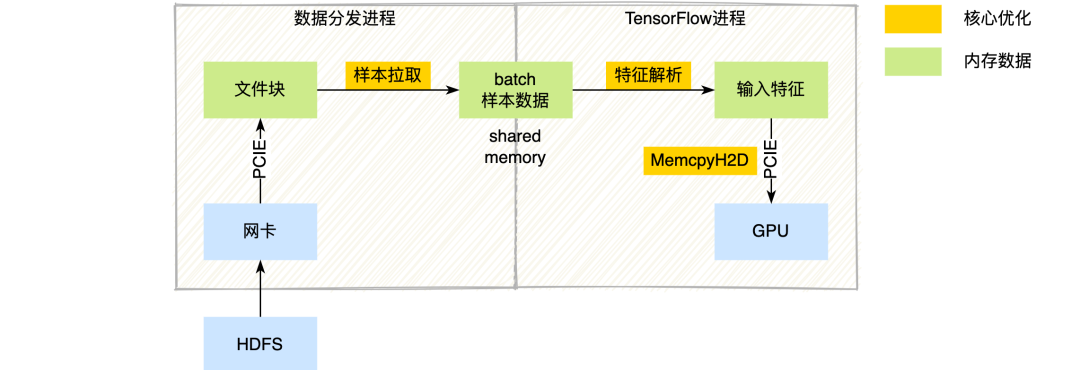 核心流程:数据分发进程通过网络读取 HDFS 样本数据(TFRecord 格式)到内存中,然后通过共享内存 (Shared Memory) 的方式把样本数据传输给 TensorFlow 训练进程。TensrFlow 训练进程收到样本数据后,走原生的 TensrFlow 特征解析逻辑,拿到特征数据后通过 GPU MemcpyH2D 到 GPU 显存中。我们通过模块化压测分析发现,数据分发层的样本拉取、TensrFlow 层的特征解析以及特征数据 MemcpyH2D 到 GPU 等几个流程,都存在较大的性能问题(图中黄色流程所示),以下详细介绍我们在这几块所做的性能优化工作。