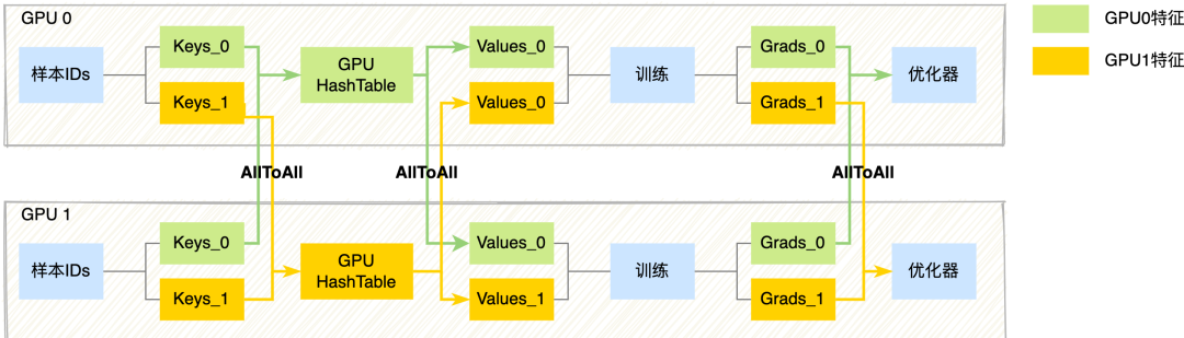 稀疏特征(ID 类特征,规模较大,使用 HashTable 存储):由于每张卡的输入样本数据不同,因此输入的稀疏特征对应的特征向量,可能存放在其他 GPU 卡上。具体流程上,训练的前向我们通过卡间 AllToAll 通信,将每张卡的 ID 特征以 Modulo 的方式 Partition 到其他卡中,每张卡再去卡内的 GPUHashTable 查询稀疏特征向量,然后再通过卡间 AllToAll 通信,将第一次 AllToAll 从其他卡上拿到的 ID 特征以及对应的特征向量原路返回,通过两次卡间 AllToAll 通信,每张卡样本输入的 ID 特征都拿到对应的特征向量。训练的反向则会再次通过卡间 AllToAll 通信,将稀疏参数的梯度以 Modulo 的方式 Partition 到其他卡中,每张卡拿到自己的稀疏梯度后再执行稀疏优化器,完成大规模稀疏特征的优化。详细流程如下图所示: