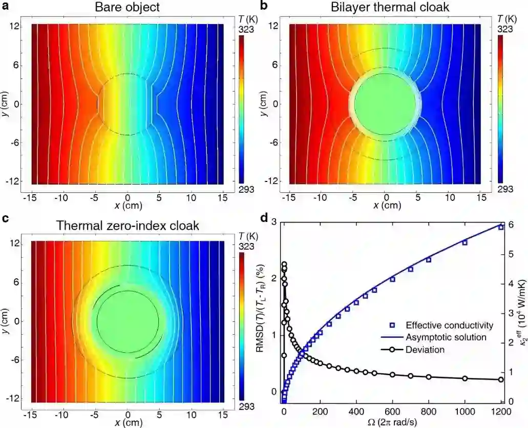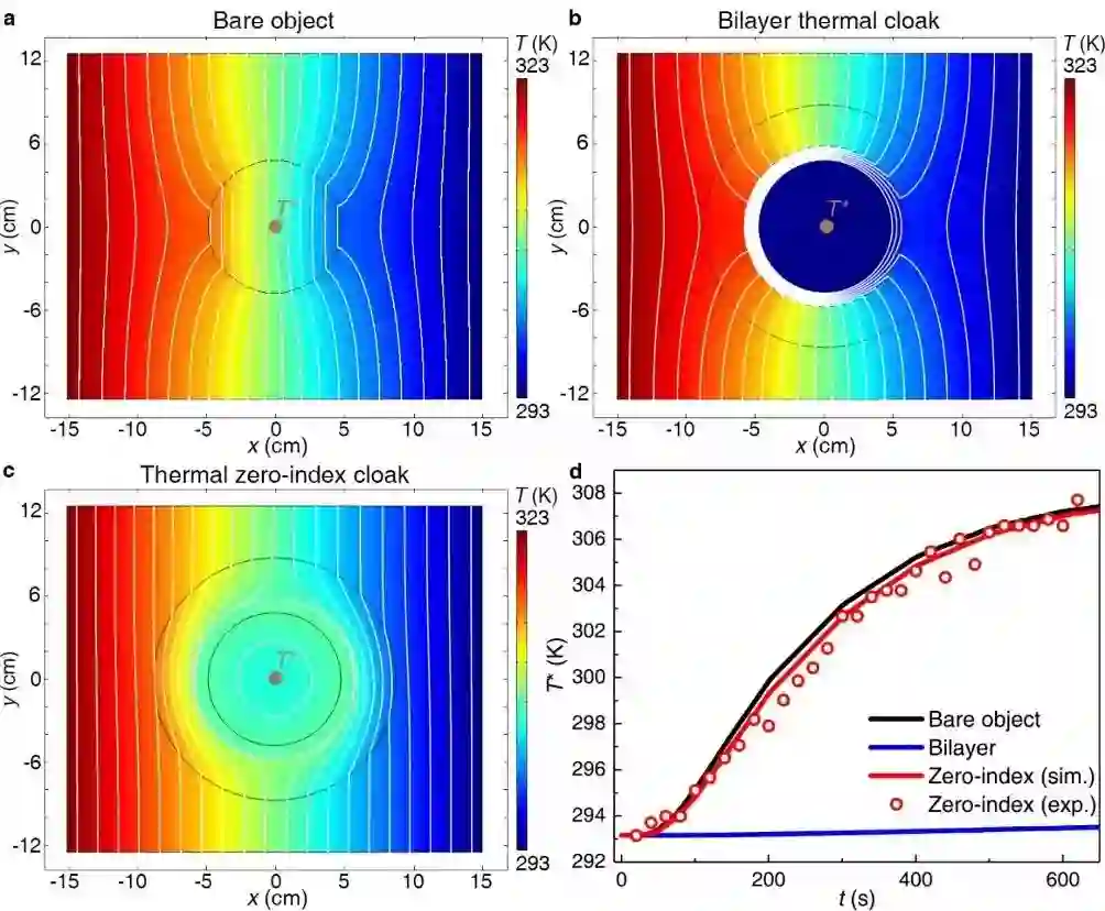 零折射率热斗篷这种基于常用材料的设计很容易实验实现。如图4a所示的电机带动转盘的系统即可驱动水流达到所需的转速。而外层的热导率可以通过在结构上打孔,基于等效介质近似获得(图4b)。用红外成像仪拍摄的图像清楚展示了当水处于静止(图4c)和被驱动(图4d)时的温度场。后者不仅达到了理想的热隐身效果,且内部物体的温度也跟随了环境温度的变化。