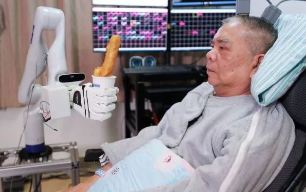 但是,经过系统训练后,现在他可以用意识操控机械手臂和人握手,拿饮料、吃油条,甚至还能玩麻将!如果给他一副机械外骨骼,是不是就能完全自理了呢?