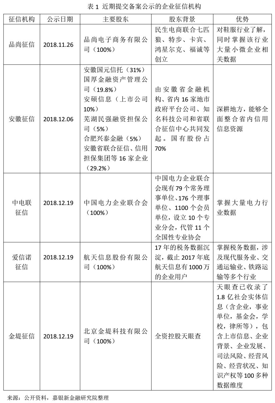2017年以来,两家外资机构邓白氏和益博睿取得企业征信备案。2018年11月,内资企业征信备案重启,目前已有5家公司备案公示,详见表1。