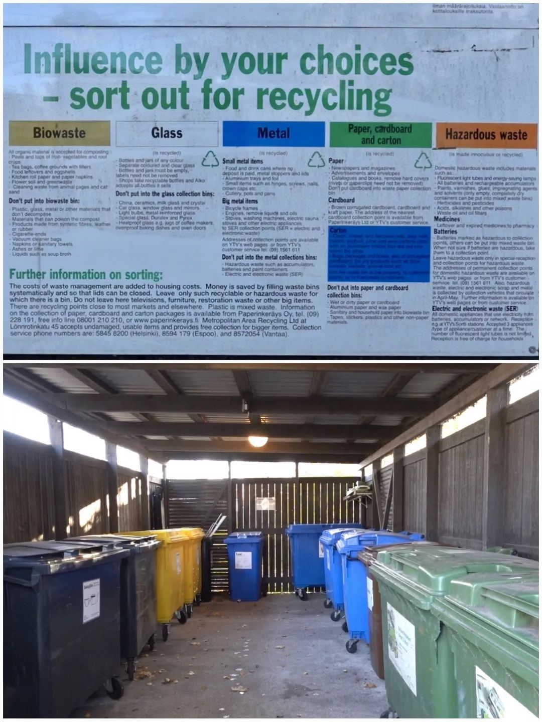 但即便到现在,也不是所有人都能够实现垃圾分类。在芬兰,如果不分类会怎么样?「也不会怎么样,但是不分类的混合垃圾处理费会比分类垃圾的高一些。」Hanna解释。而如果总有人将不分类垃圾扔到公寓的垃圾回收站的话,则会导致整个公寓的垃圾处理费增加,平摊到个人头上的费用也会相应增加。