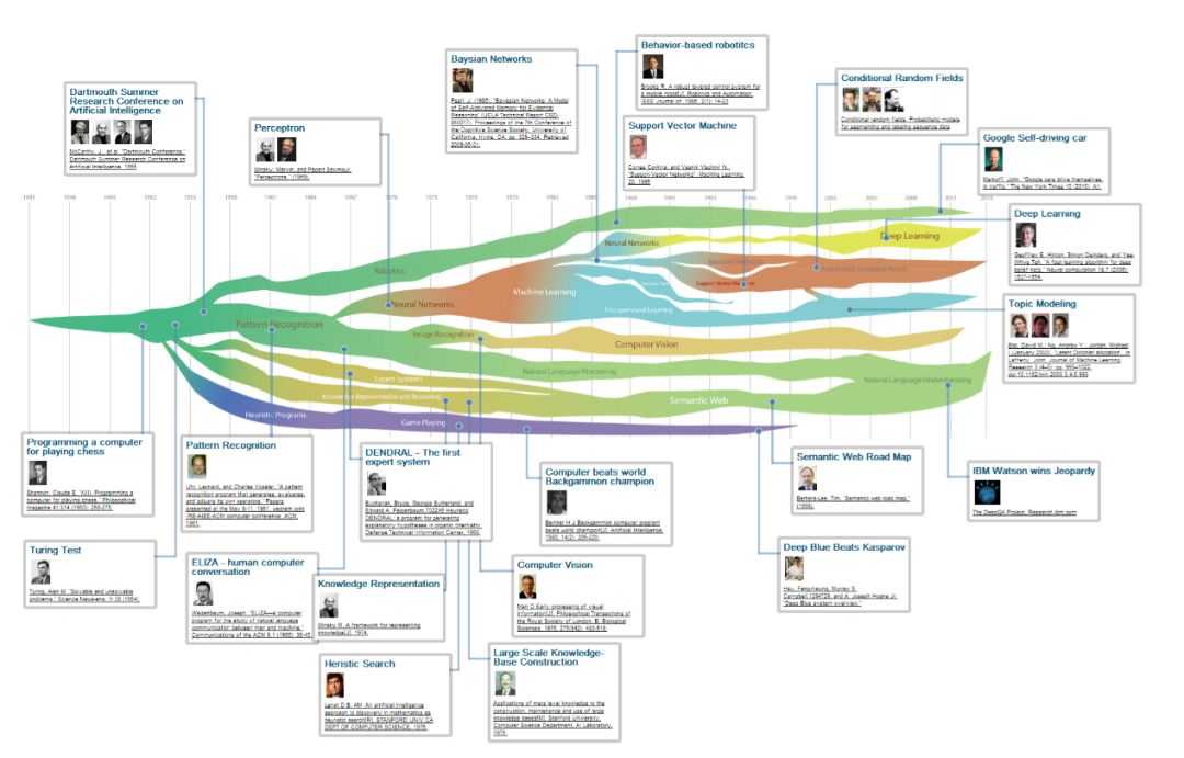 技术发展趋势分析是当前的一个研究热点。项目团队基于AMiner多年积累的数据资源及技术基础,能自动分析挖掘不同技术领域的发展趋势,标出分支技术及技术发展历程中的重要人物及事件(代表论文)。同时支持发现领域技术热点及进行技术前沿分析等知识服务。下图展示了AMiner对人工智能技术的技术发展趋势分析。