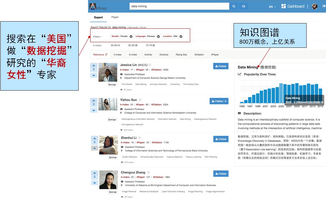 唐杰:AMiner平台以科研人员、科技文献、学术活动三大类数据为基础,构建三者之间的关联关系,深入分析挖掘,面向全球科研机构及相关工作人员,提供学者、论文文献等学术信息资源检索,以及如学术评价、专家搜索/推荐、学者地图、学者关系网络分析、研究兴趣发展变化分析、技术发展趋势分析等专业知识服务。典型功能服务包括: