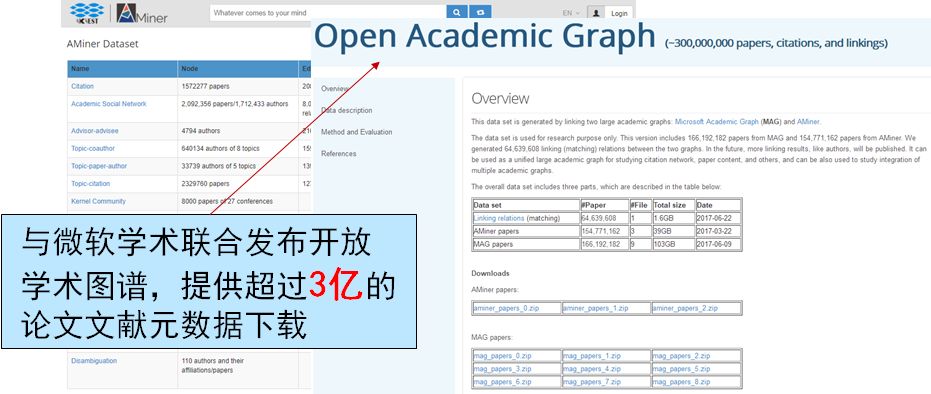 AMiner一直以来都非常强调开放共享。提供平台学者及论文等数据的访问API接口,可以直接调用查询平台相关学术数据。同时提供学术资源下载,开放共享学术数据超过2亿条,累计数据下载超过230万次。近期联合微软学术发布了开放学术图谱,提供超过3亿的论文文献原数据下载。