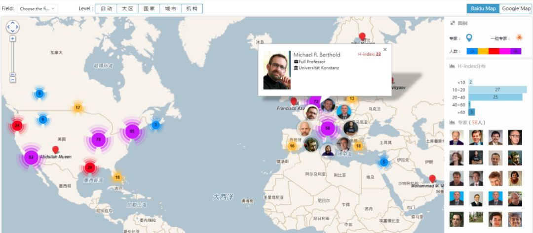 全球学者分布地图直观地展示特定技术领域专家学者在全球的分布情况,可以快速定位技术研究热点地区及区域内的权威专家,展示特定区域的专家统计分析情况,方便进行不同区域不同专家之间的对比分析。下图展示了“机器学习”领域全球学者的分布情况。